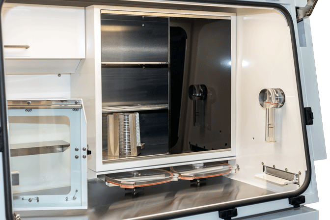 • New hinged front flange for easy loading of lab devices, supplies, and appliances for full access to all areas of the chamber and incubator