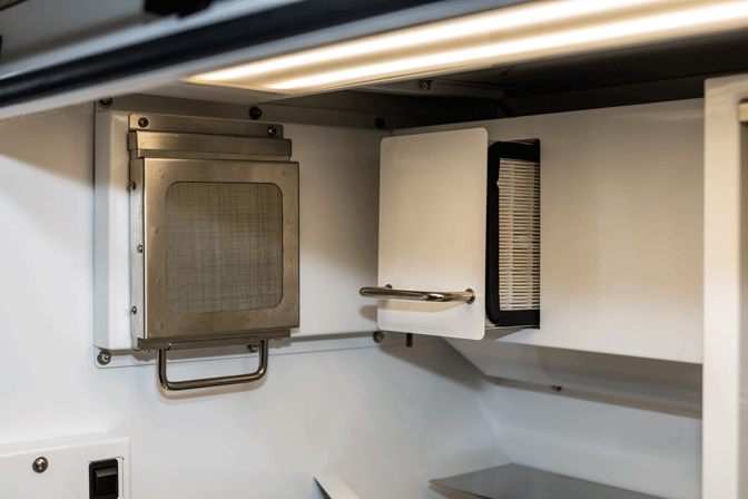 • New workspace chamber HEPA filtration system captures very fine particles.
